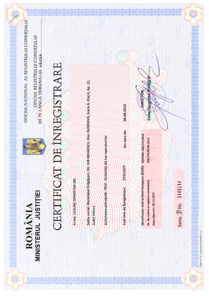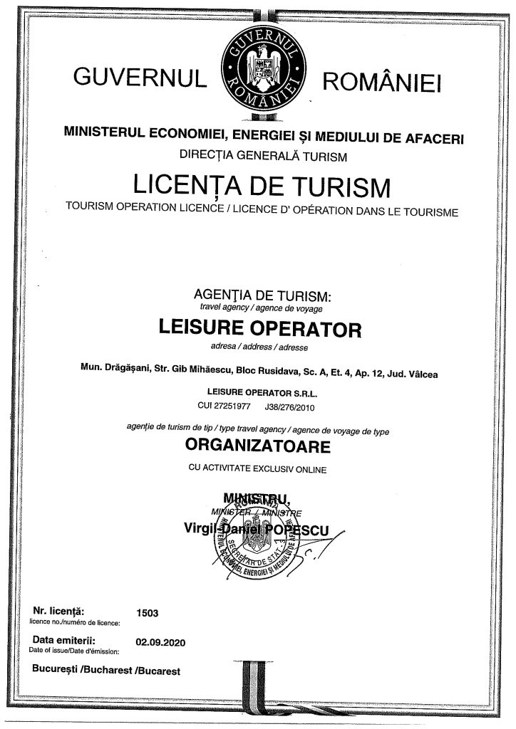 Suntem organizator de turism din 2010, certificările pot fi verificate pe Ministerul Turismului